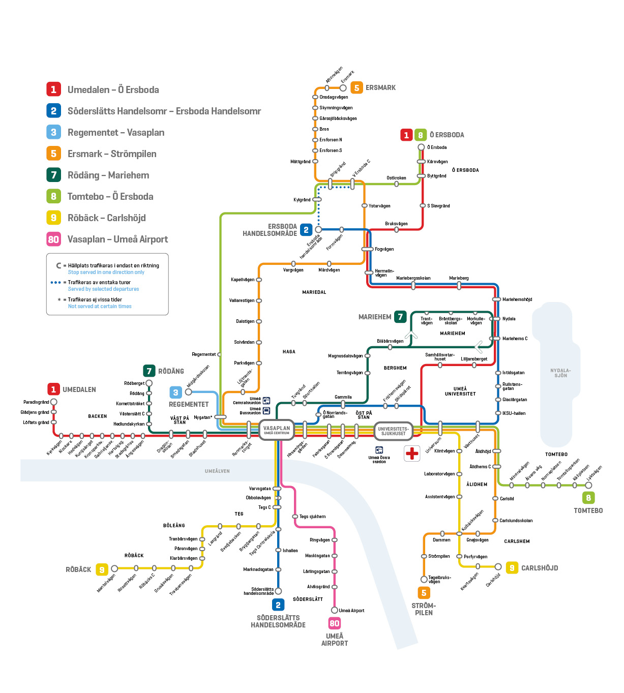 Linjesträckning och hållplatser för linjerna 1 till 9 samt flygbussen i Umeå, se beskrivning